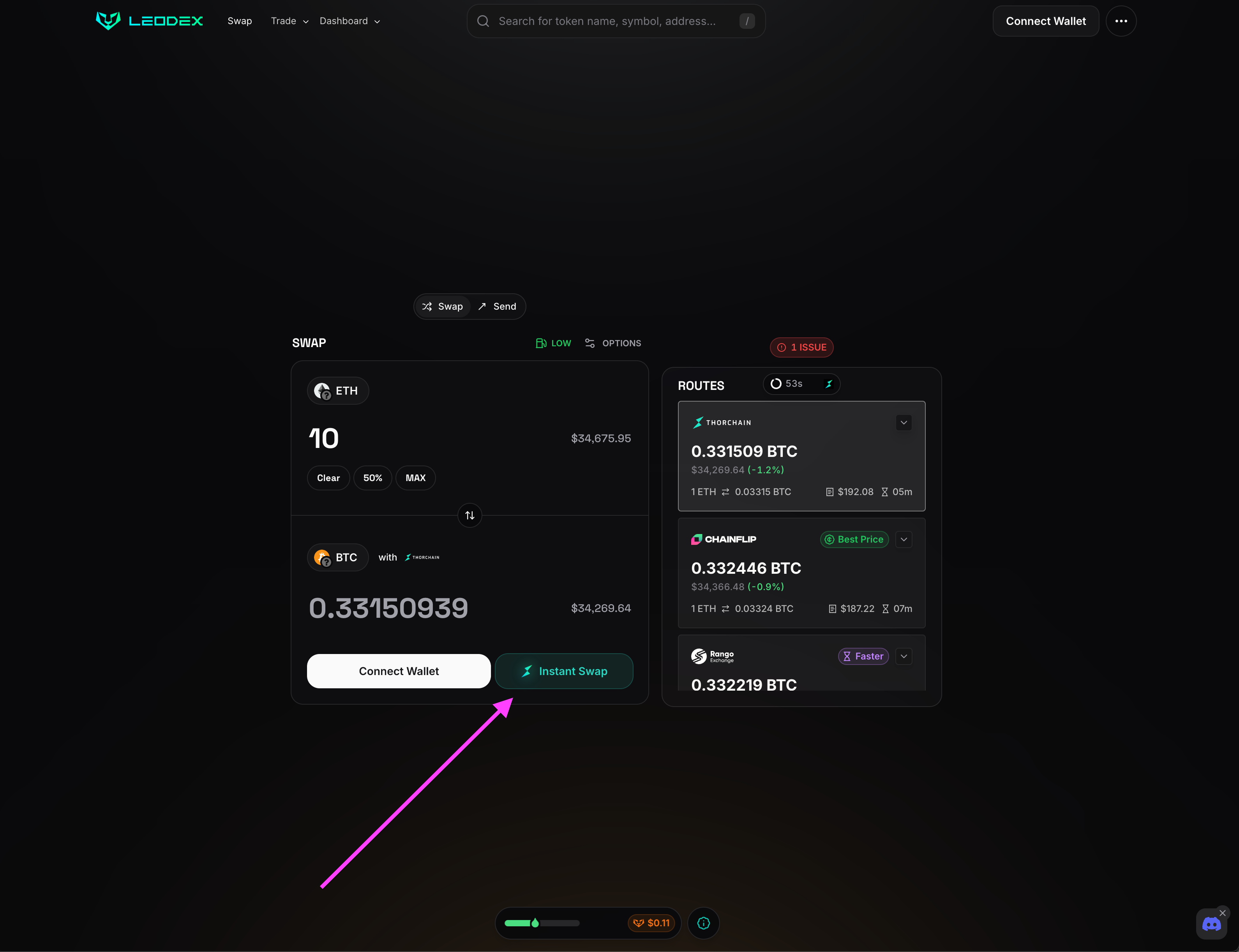2). Click Instant Swap (next to the connect wallet button)