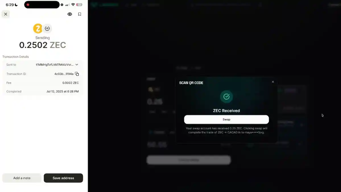 The UX this creates is flawless and super enjoyable. From your POV, you are scanning a QR code and simply sending ZEC to an address then clicking one button afterwards to complete the swap.